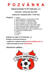 Pozvánka na valnou hromadu TJ FC Hněvotín, z.s. 20.11.2021